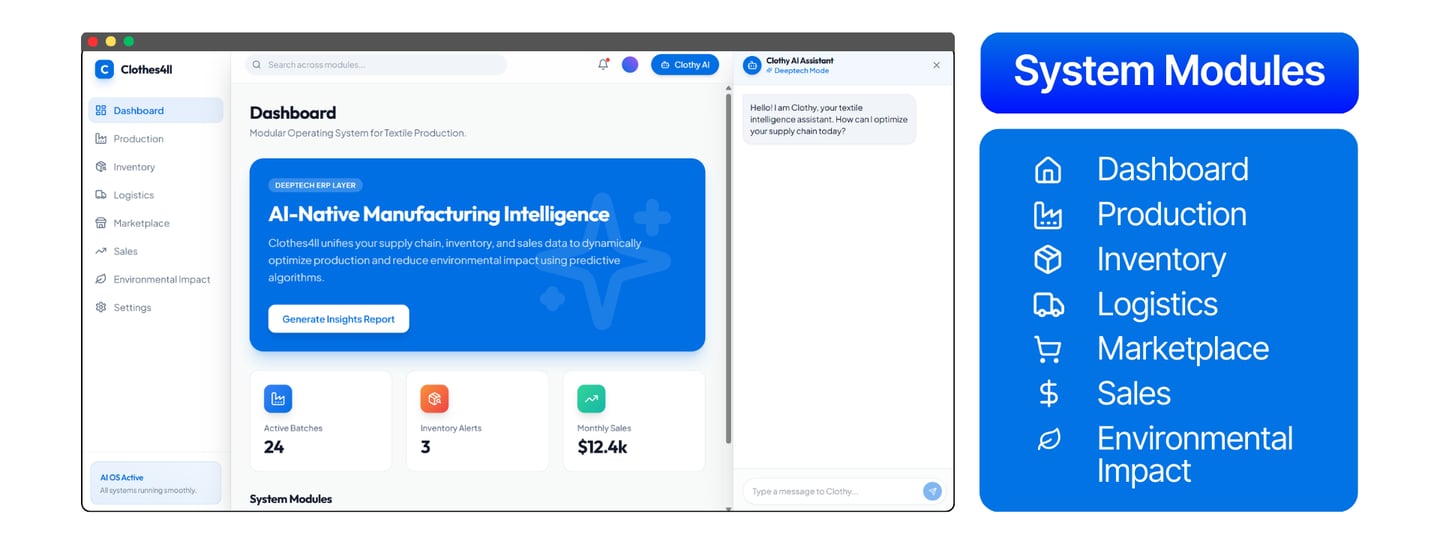 At Clothes4ll, we are a team of young entrepreneurs driven by innovation and sustainability, working to transform the fashion and textile industry. We believe the sector needs more efficient and circular systems, especially for the thousands of SMEs that struggle with material waste, inefficient operations, and limited digital tools.
